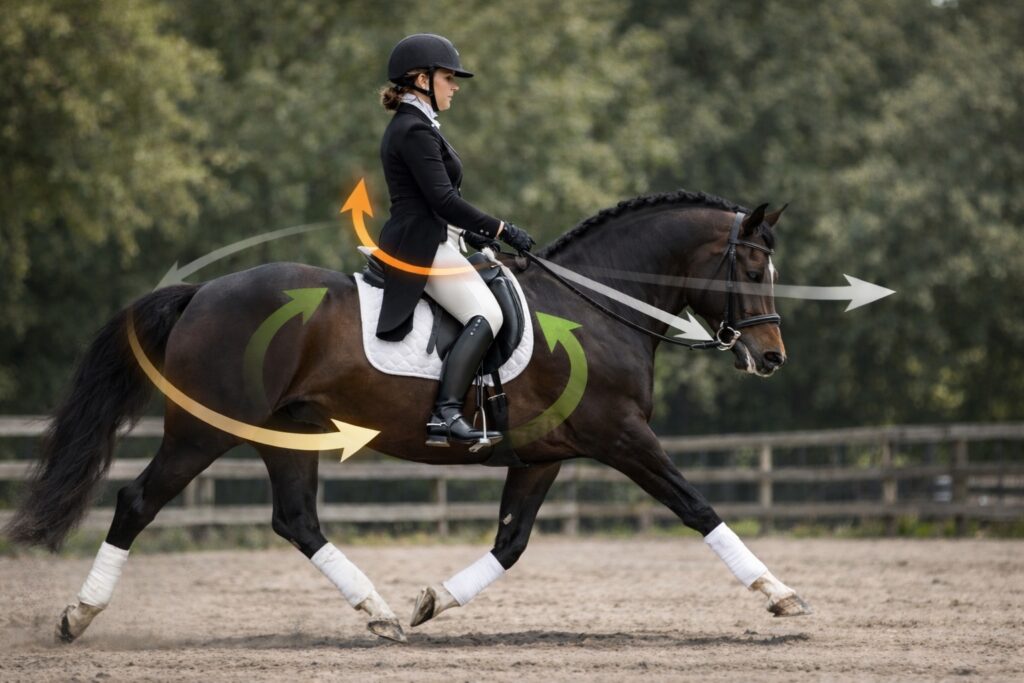 Energy has direction. It comes from the hind legs. It travels over the topline. Then it reaches the poll and mouth. Finally, it flows through the reins into my elbows, shoulders, and back. However, the loop only works when I send energy forward and receive it without blocking. Therefore, “connection” does not mean holding the head. It means guiding a moving body. You can often see it immediately: