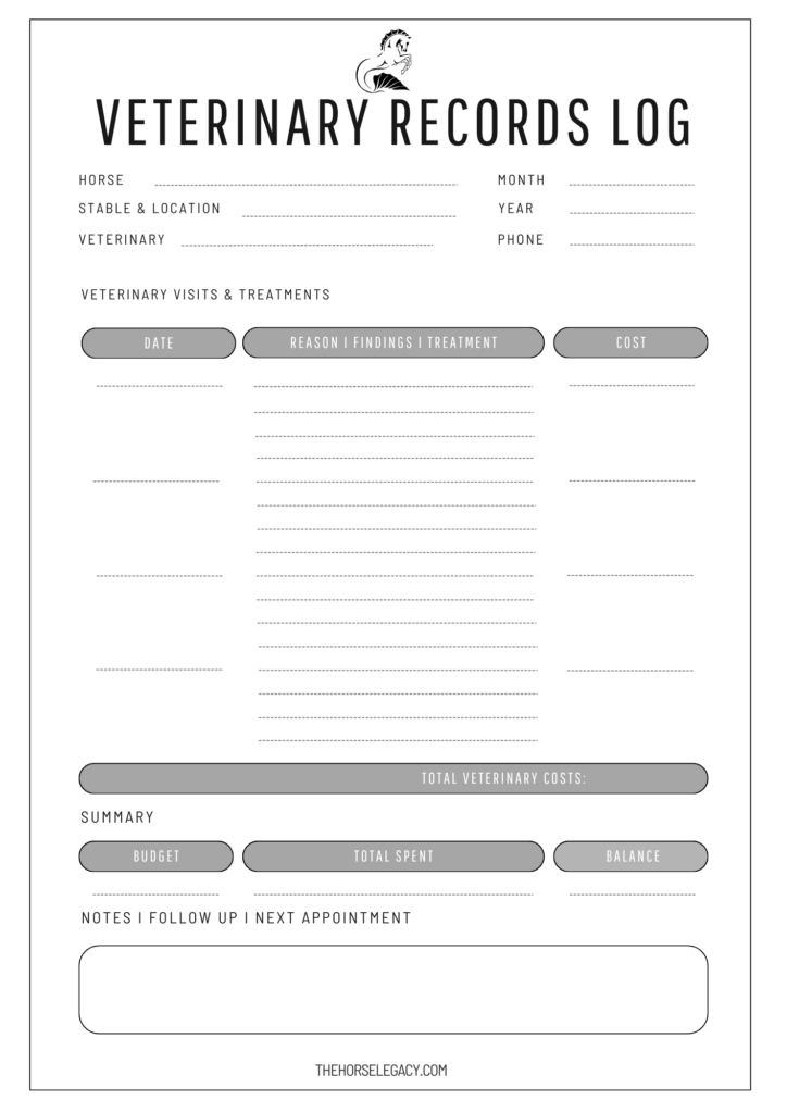 Track horse veterinary visits, treatments, costs, follow-ups, and contact details.